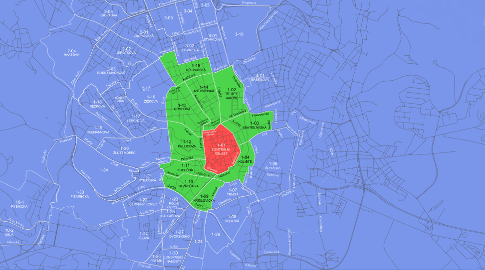- zbytek města s regulací pouze v pracovní dny v čase 17 až 06 hod.